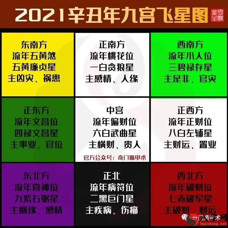 2021年是辛丑流年,归属于下元艮八运。艮八运是以2004年到2023年,八白左辅星脉运行。2021年八白左辅星飞临兑宫正西方,八白左辅星脉运行,旺象。